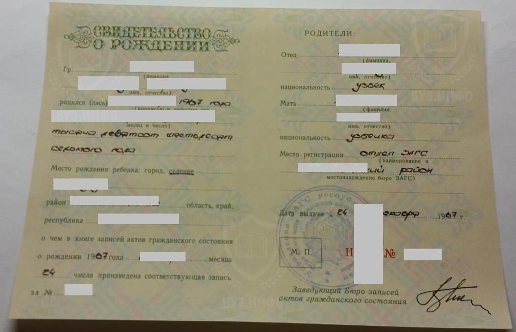 У нас есть свидетельства о рождении любых советских республик (СССР). Также мы можем сделать любое современное свидетельство любого ЗАГСа. От вас нужны все данные. Их можно выслать на Ватсапп или e-mail. Кроме этого вы можете купить справку об отсутствии судимости на нашем сайте. Покупая больше одного документа вы получаете значительную скидку.